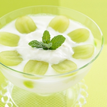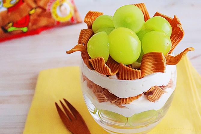 ドデカイラーメンの形状を生かしてマスカットを抱え込んだ可愛いトライフル。甘酸っぱいヨーグルトクリームとドデカイラーメンのしっかりした味のコンビが絶妙。刺さったドデカイラーメンでクリームをすくいながら一緒に食べると美味しいです。